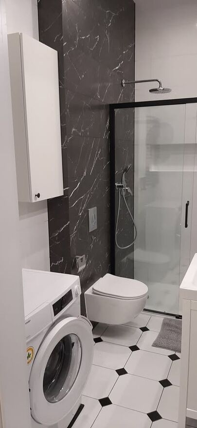 Kabina prysznicowa z drzwiami przesuwnymi,umywalka z szafką,toaleta,suszarka na ubrania,pralka SHARP,kosz na pranie,uchwyty na ręczniki, szafkami wiszące na kosmetyki,wysokie lustro,kinkiet oświetleniowy